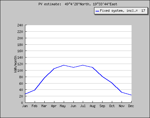 Ďalším nerozumným očakávaním je „chcem fotovoltikou kúriť v podlahovom kúrení“. Na obrázku nižšie je možné vidieť odhad ročnej výroby 1 kW FV systému v konkrétnom mieste severného Slovenska. Ako vidno, tak zimné mesiace dodajú sotva 1/5 letnej mesačnej produkcie.