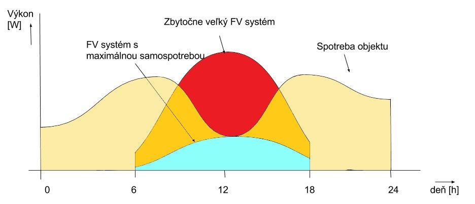 Preto je potrebné navrhovať systémy s rozumom. Na obrázku sú dva FV systémy – jeden (s prevažujúcou červenou plochou) je zbytočne veľký a jeho výroba je z veľkej časti zadarmo odovzdávaná nadradenej sústave. Druhý v tomto prípade zabezpečuje 100 % samospotrebu – všetka vyrobená elektrina je v dome aj spotrebovaná.