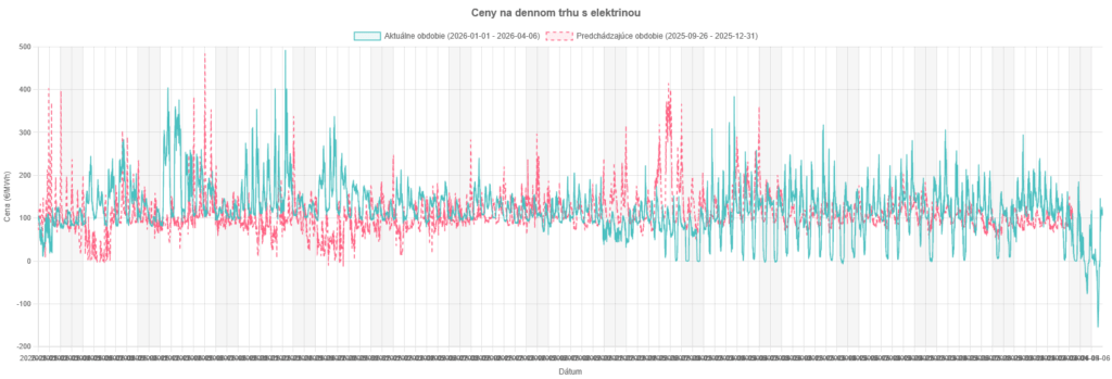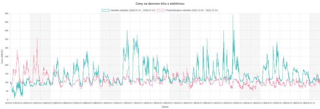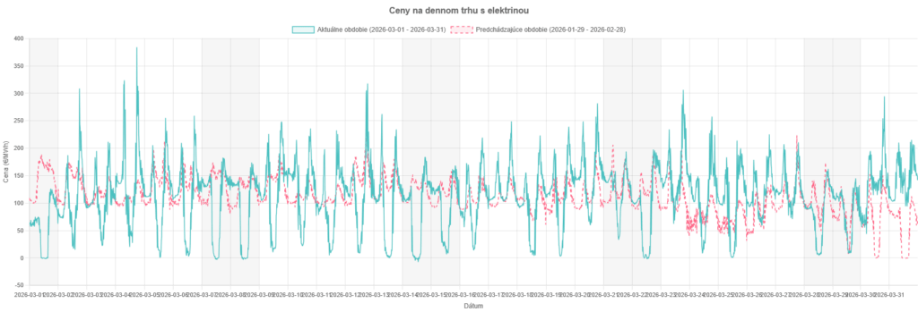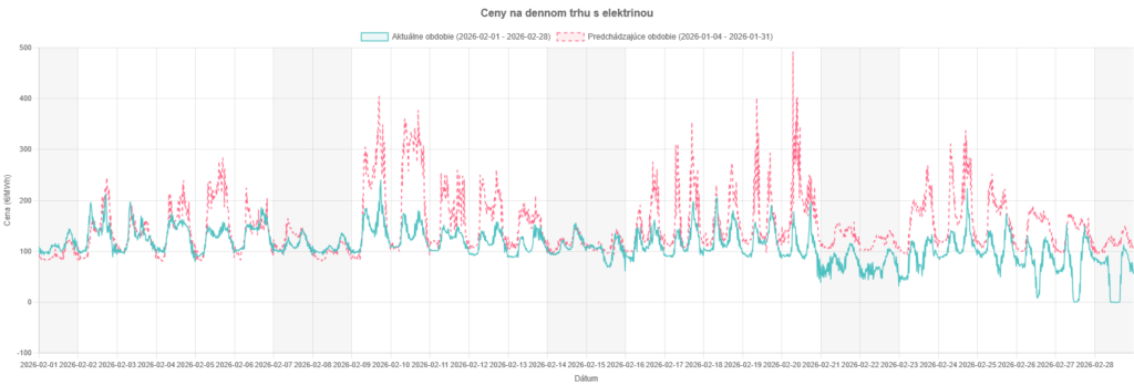 Rok 2026 začal pomerne stabilnou cenou spotu, teda stabilnou na „spodnej“ úrovni. Vrch najmä v januári lietal celkom dosť – až ku 500 €/MWh. Február sa „upokojil“ a cena sa pohyboval skoro stále medzi 100 až 200 €/MWh.