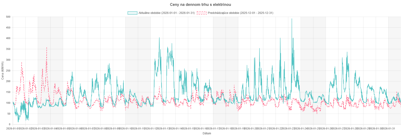 Začiatok roku (január) sa teda niesol v znamení vysokých cien na spote (OKTE.sk, lepší graf „u nás„). Minimálna cena bola 11,04 €/MWh (ale to len v prvých dvoch dňoch roka), Maximálna 491,43 €/MWh. Priemer 142,52 €/MWh. Teda celkom viac ako je „bežná“ cena pre domácnosť s energopomocou. A aj pre tých bez energopomoci. je to viac ako ich cenníková cena.