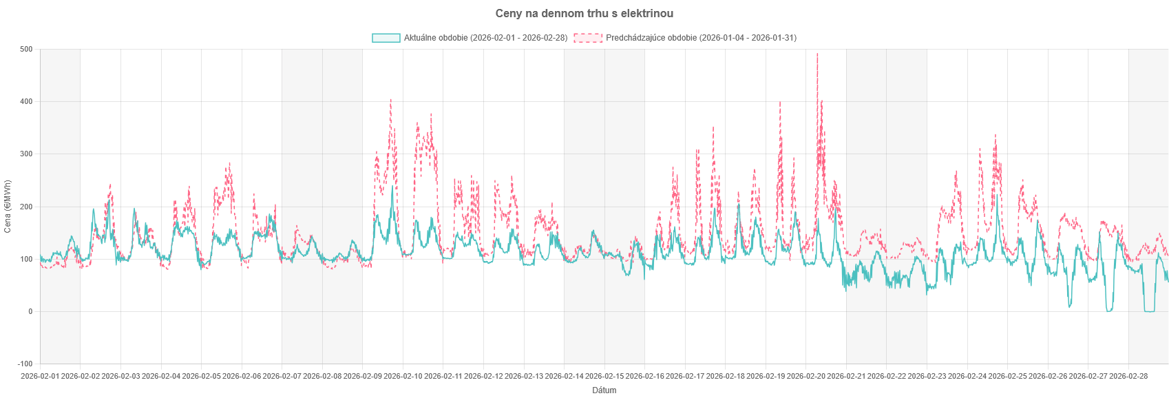 Február viedol k upokojeniu. Ak neberieme posledné tri dni, tak Min: 31,75 €/MWh, Max: 239,82 €/MWh a priemer: 114,91 €/MWh. Pre celý mesiac sa priemer znížil o viac ako 4 €/MWh: Min: -0,46 €/MWh, Max: 239,82 €/MWh, Priemer: 110,34 €/MWh.
