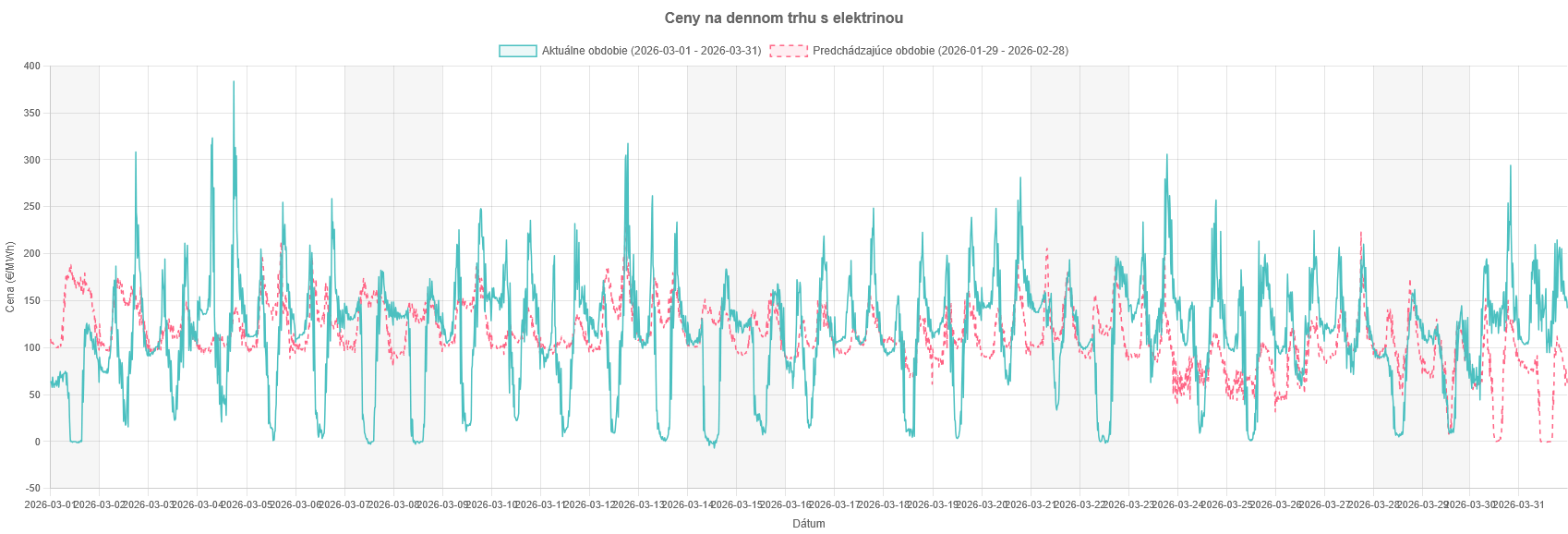 Minimálna cena klesla na -6,81 €/MWh, maximu bolo až 383,46 €/MWh a priemer bolo podobný februáru 113,72 €/MWh.