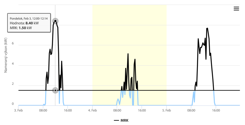 Reálny graf prekročenia MRK výrobcu. Výrobca má 15 kW CiV – (Celkový inštalovaný výkon) ale MRK len na úrovni 10 % CiV, teda 1,5 kW. Ako vidno na grafe, tak v začiatku februára prekročil MRK na 8,4 kW. To je necelých 7 kW naviac. A makľko sa berie každý „začatý“ kW, tak PrekMRK je 7 kW.